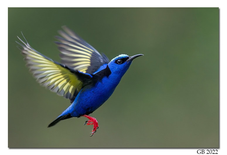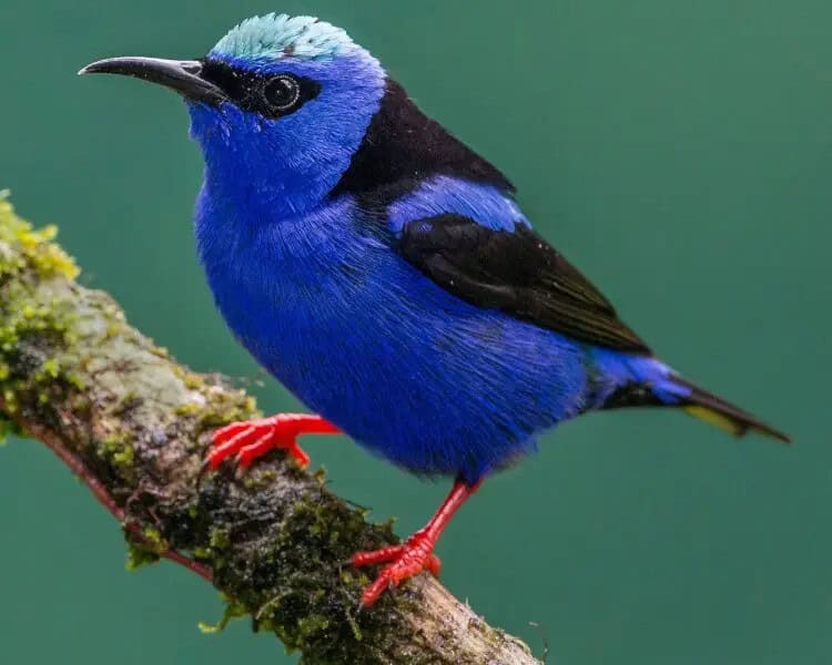 The Red-legged Honey Bunting stands out with its bright red bill, measuring only 10–11 centimeters and weighing between 9–12 grams. Males of the species have a striking blue head and neck, complemented by a red patch on their lower throats and a black marking around their eyes.