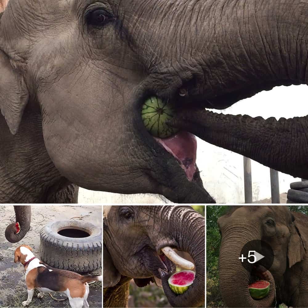 Playful Pup Joins Joyful Elephant for a Refreshing Watermelon Feast