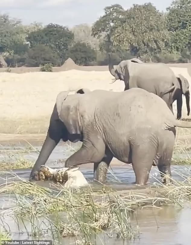 The dramatic video shows the elephant stamping on the crocodile, which looks to be between eight and ten feet long.