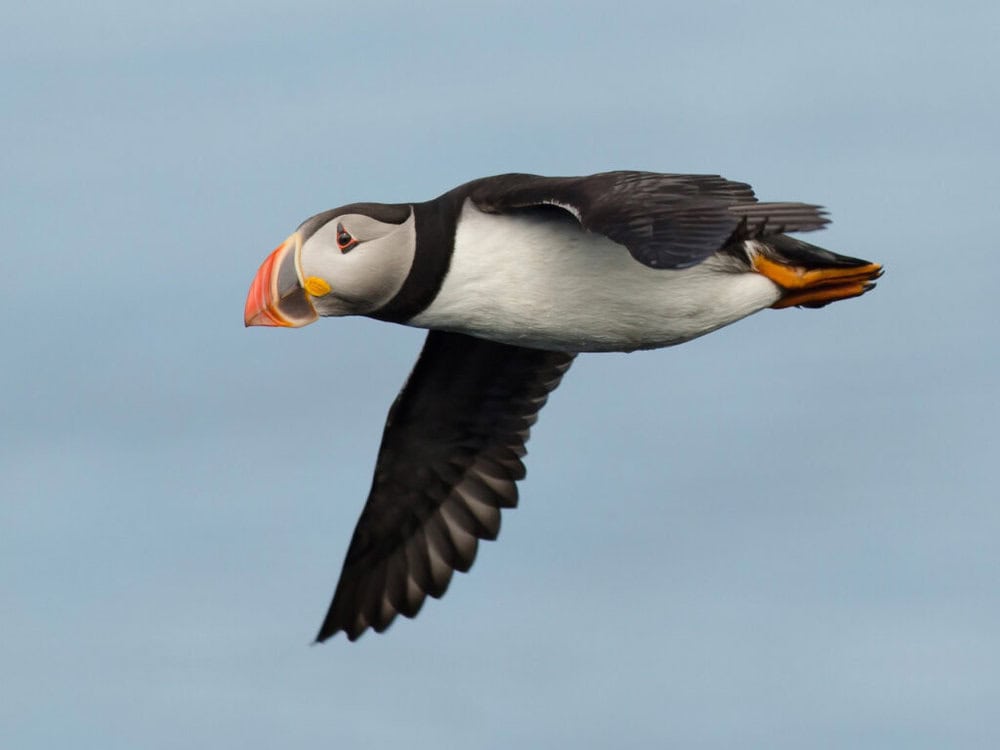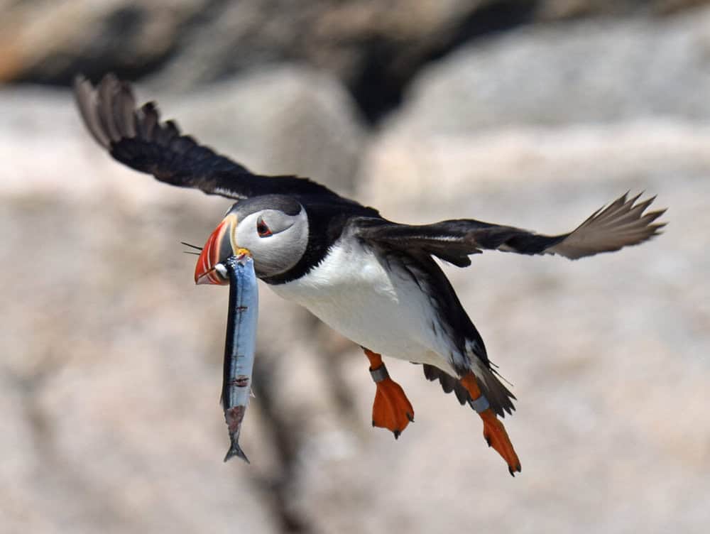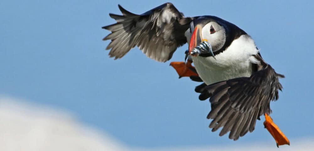 Adapted to a life at sea, Atlantic puffins are skilled divers and swimmers, using their wings to move underwater as they hunt for small fish like sand eels and herring, which comprise the bulk of their diet.