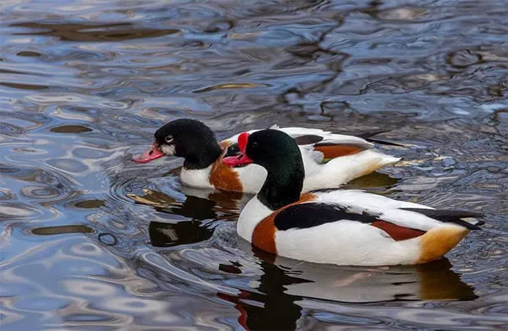 During spring, its red bill brightens, only to fade as autumn approaches. Males are distinguishable by a beak protuberance that forms in the breeding season, while females sport a small white patch between the beak and eyes, with softer tones in their plumage. Generally quiet, the shelduck’s call is seldom heard.