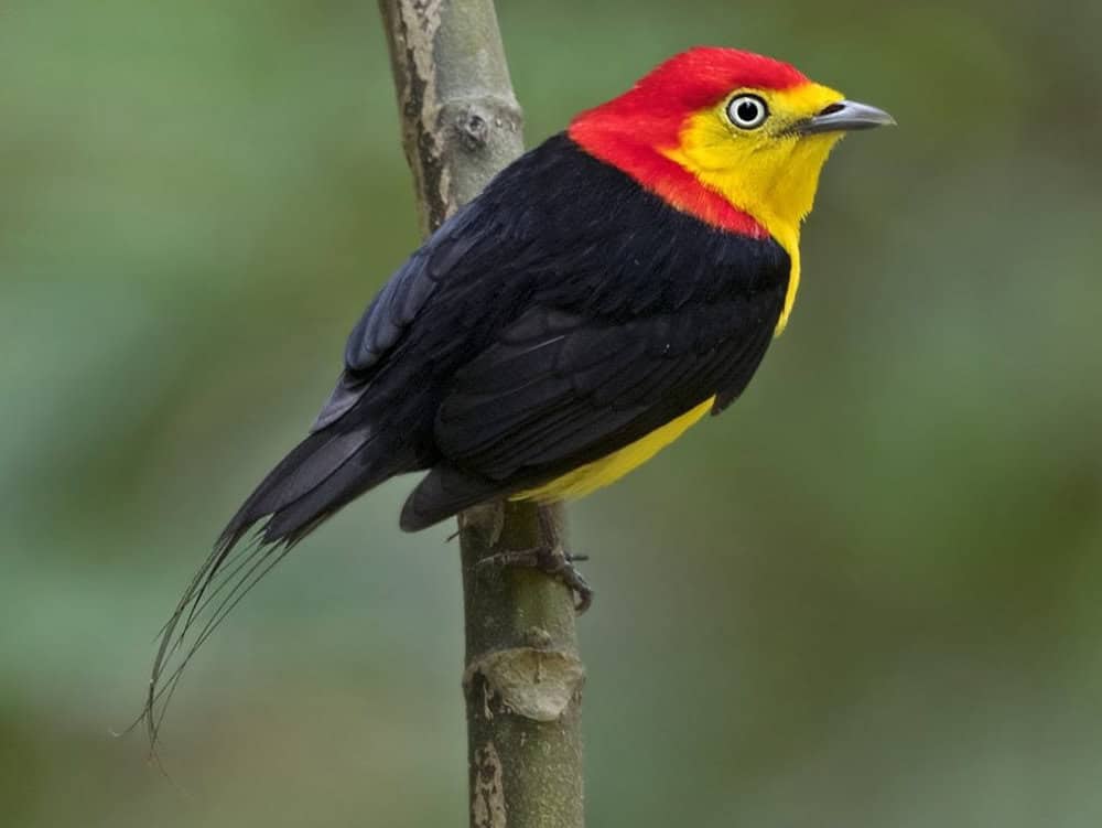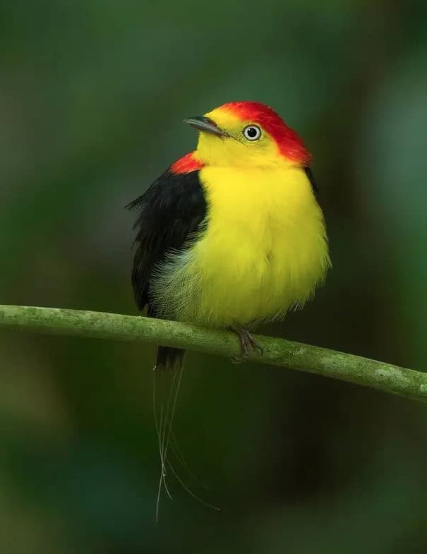 The Amazon Basin is home to various dazzling birds, and the wire-tailed manakin is among its most striking residents. This small bird is a visual standout with a vivid yellow face and belly complemented by an orange crown.